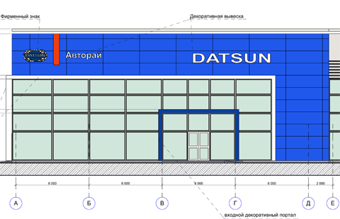 Общая площадь здания - 650 м2. Строительный объем здания - 5033,5 м3. Технический центр по продаже автомобилей марки «DATSUN» предназначен для продажи легковых автомобилей. Технический центр включает зоны продажи автомобилей, где расположены - демонстрационный зал (шоу-рум) и офисные помещения, зона выдачи и вспомогательные помещения. Административная зона (на антресоли), где расположены кабинеты офисных работников и клиентская зона. Проектная мощность объекта- продажа до 400 шт/год.